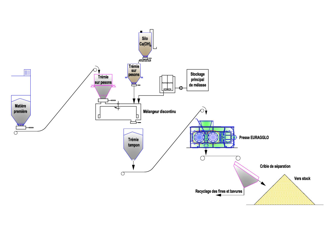 Before entering the rolls of the briquetting press, raw material is mixed with a binder in order to obtain mechanically solid agglomerates. After the briquetting step, briquettes are screened, a step that separates good quality briquettes that will then be stored for curing (forced or natural) and fines and flashings which will returned to the secondary raw material silo in order to be recycled into the agglomeration line. Briquettes produced are ready to be used as secondary raw materials.